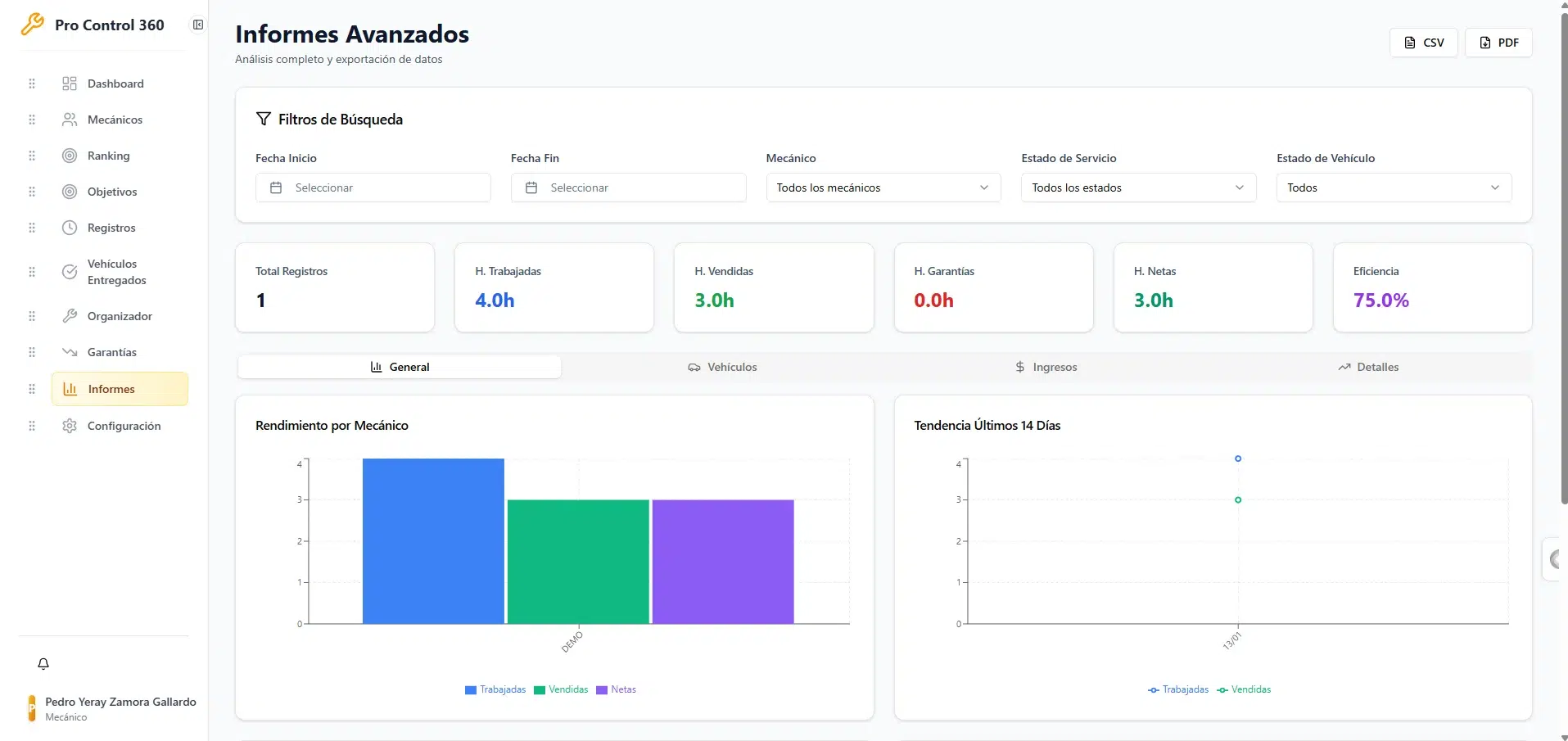 Un software para llevar el control del rendimiento operativo del taller: mecánicos, registros de horas, ranking, objetivos, garantías, organizador e informes desde un panel único.